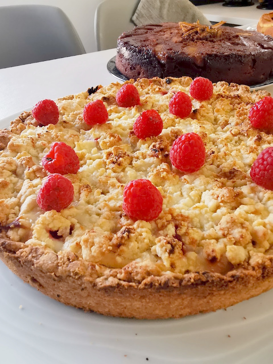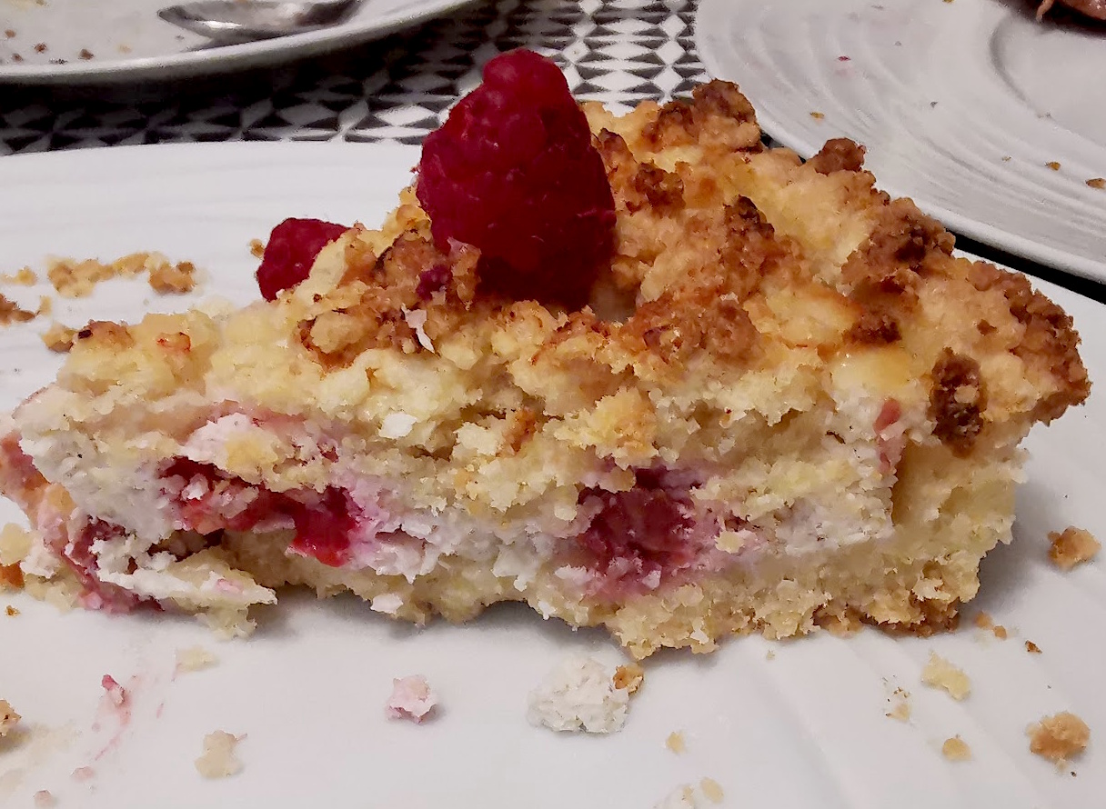 Comme je ne suis pas raide dingue de ricotta, je l’ai mélangée à du Mascarpone et du yaourt grec, comme l’avait fait Brigitte du Blog les filles à table qui se fait bien trop rare maintenant sur son blog….. dommage. Elle avait mis des fraises, moi j’ai mis des framboises, le primeur de ma fille lui offre toujours une barquette de framboises à chacun de ses passages, je n’ai donc pas eu à réfléchir longtemps pour savoir avec quels fruits je ferais cette Sbriciolata.