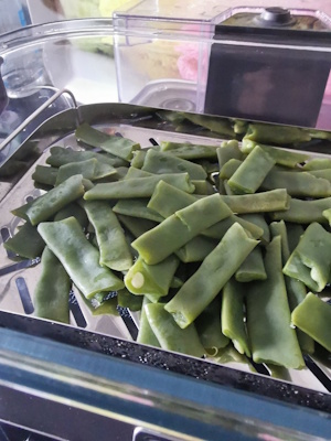 • Laver les haricots coco et les couper en 3 avec les mains. Les placer au cuit vapeur et les cuire une quinzaine de minutes. Réserver