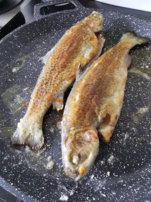 • Fariner les truites sur les deux faces. Ajouter un peu d’huile dans une pôle puis les faire griller. Poivrer