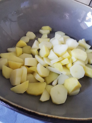 - Eplucher les pommes de terre, les laver puis les couper en morceaux.