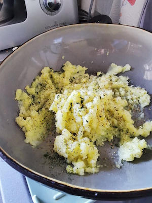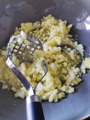 - Après la cuisson, retirer les gousses d’ail et retirer ensuite les pommes de terre à l’aide d’un écumoir et les mettre dans un grand plat pour pouvoir les écraser au presse purée. Réserver un peu d’eau de cuisson