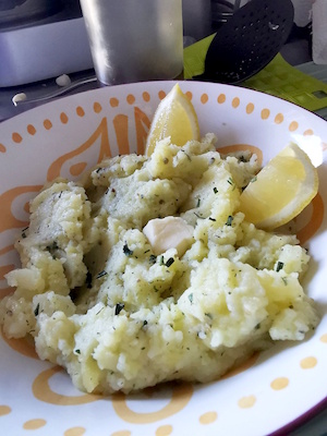 Bonjour !! Je réalise souvent de l’écrasé de pomme de terre à la place de la purée. Aussi, lorsque Viviane, créatrice du joli blog Quoi qu’on mange dont les photos et recettes me font toujours autant saliver, a publié la recette de son écrasé, elle m’a rappelé combien il était délicieux de remplacer le beurre par de l’huile d’olive dans un écrasé. Bien que je l’utilise aussi de temps en temps, il y avait longtemps que je ne l’avais pas dégusté ainsi. Elle m’a donné tellement envie que, bien que j’avais déjà commencé la cuisson des épinards, qui devaient accompagner mon saumon, je suis partie en cuisine faire cet écrasé et compléter mon accompagnement.