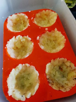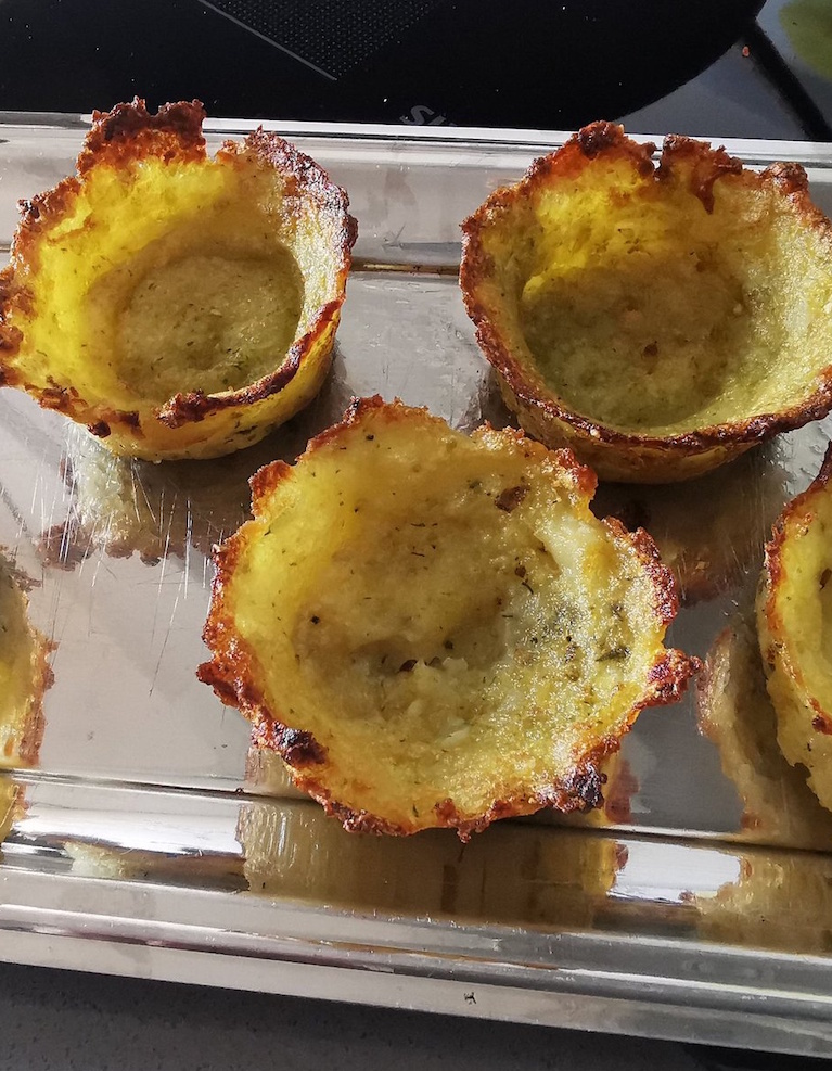 | 1- Il est préférable de ne pas faire ces coques de pommes de terre dès que l’écrasé est fait. Le laisser une nuit au frigo à couvert est préférable. La pomme de terre se manipule mieux une fois séchée. Utilisez un moule en silicone ! 2-Il va sans dire qu’il faut surveiller la cuisson. Les bords doivent être dorés, à ce moment là mettre une feuille d’alu sur les coques pour poursuivre la cuisson. Vous pouvez aussi les laisser au four 10 minutes de plus four éteint. |
