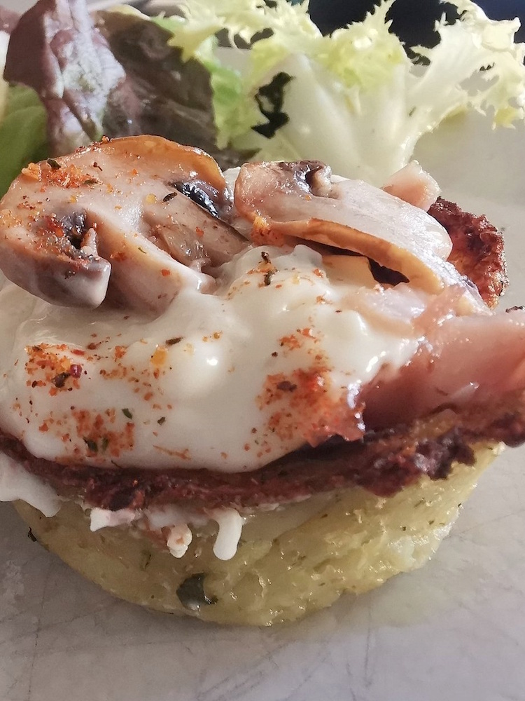 Comme elle, je l’ai donc réalisé, parfumé d’ail, de citron et d’herbes séchées et bien sûr d’une bonne huile d’olive que je garde en réserve pour les plats d’exception. Le problème est que forcément il m’est resté de l’écrasé, vu mes épinards. Je me suis donc décidée de faire avec des coques d’écrasé de PDT que j’ai simplement fourrés après avec un mélange de champignons, jambon cuits auquel j’ai ajouté du Gorgonzola. C’est vraiment pratique et trop sympa pour faire de jolis petits accompagnements, comme mes Muffins salés de pommes de terre, épinards et coppa je ne peux que vous le conseiller !