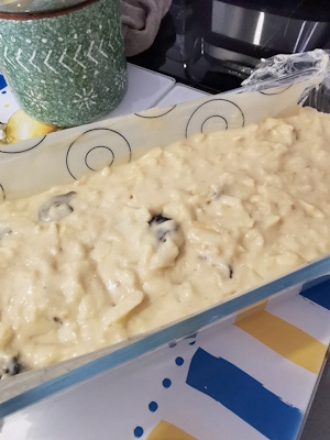 C’était encore la poisse, plus de calvados, j’ai du me rabattre sur du rhum pour faire macérer mes pruneaux. En pâtisserie je reste fidèle aux recettes que je choisis car je ne la maitrise pas bien mais là j’ai trouvé qu’il y avait trop de sucre et trop de beurre, j’ai donc diminué les quantités. J’ai commencé à faire mon cake mais après avoir incorporé la farine j’ai vraiment trouvé la pâte très très épaisse. Tellement que je me demandais comment j’avais pouvoir verser la pâte dans le moule. Du coup j’ai ajouté un yaourt grec (j’en mets souvent dans mes cakes). Je me suis abstenue de mettre ma pincée de Bicarbonate, car il y avait un sachet entier de levure chimique dans la recette alors que moi je n’en mets habituellement qu’un demi. Après tous ces changements, je me demandais bien comment allait être ce cake ?