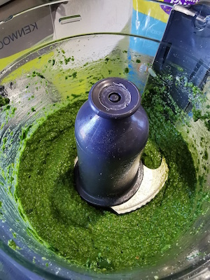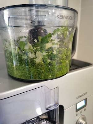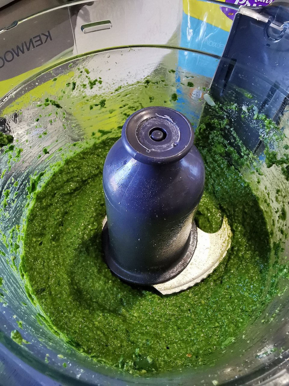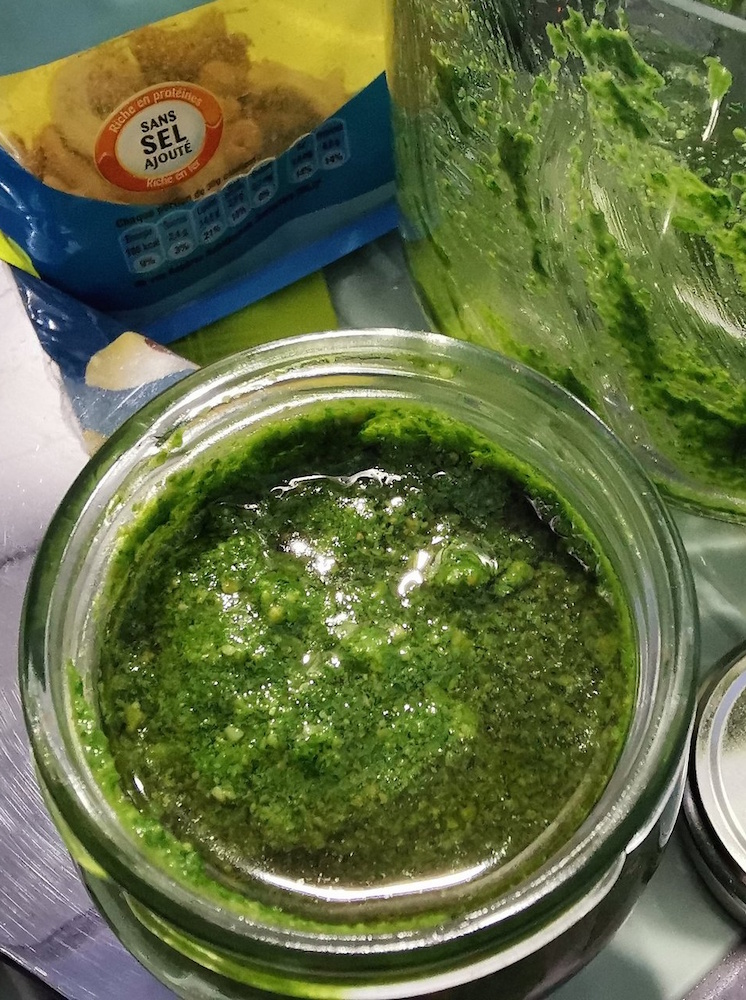 Je ne l’avais pas publié, alors comme cette année j’ai eu la chance de trouver cette herbe si merveilleuse, je vous le propose. Sa particularité : les pignons sont remplacés par des noix de cajou non salées.. j’ai un peu hésité mais bon qui ne tente rien n’a rien ! Je n’ai rien pesé, ce que je vous donne en quantité sont des poignées… désolée