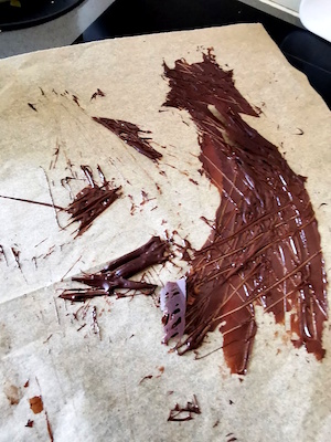 • Etaler le chocolat sur une feuille de papier cuisson très très finement. faire des stries avec une fourchette et placer la feuille à plat au CONGELO pour au moins une heure