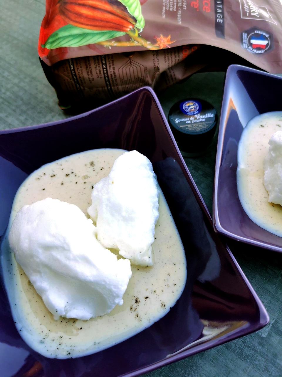 Pour illustrer ce thème, j’ai eu envie de faire une ile flottante. Il y a une éternité que je n’en avais pas fait et avec mon robot Cooking chef il est impossible de rater la crème puisque l’on peut régler la température. La vanille serait illustrée bien sûr par la crème anglaise et j’avais dans l’idée de faire des plumes en chocolat. Seulement voilà, il y a tellement longtemps que je ne fais plus ce genre de plat, que j’ai complètement oublié, que pour faire des déco en chocolat, c’est au congélo qu’il faut les mettre et pas au frigo, quelle andouille! Du coup, forcément c’était raté, j’ai donc saupoudré généreusement de chocolat rapé mes iles flottantes. Heureusement et comme il me restait des oeufs en neige, le lendemain j’ai refait quelques déco au CONGELO cette fois, c’est tout de même mieux avec ces jolies petites plumes non ?