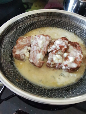 • Lorsqu’ils sont cuits, les retirer de la poêle et déglacer le roquefort dans le jus.