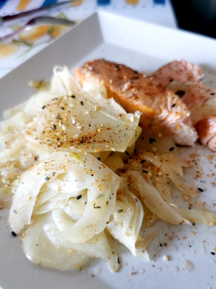 C’est ce qui s’est passé lorsque j’ai vu le saumon laqué au miel et fenouil confit de mon amie Michelle qui publie tous les jours de super recettes dans son blog Plaisir de la maison. Je n’ai pas refait intégralement sa recette comme souvent. J’ai surtout repris le choix du poisson et cette idée de fenouil confit à l’huile d’olive et citron qui m’avait immédiatement séduite et je l’ai accompagné d’un saumon aux épices libanaises et de Gomasio.