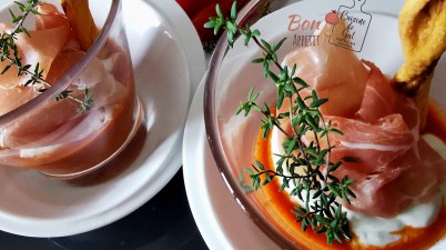 Compotée de tomates au thym, fromage frais au pesto et chiffonnade de jambon
