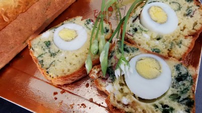 Cake aux oeufs durs, coppa, feta à la truffe et ail des ours