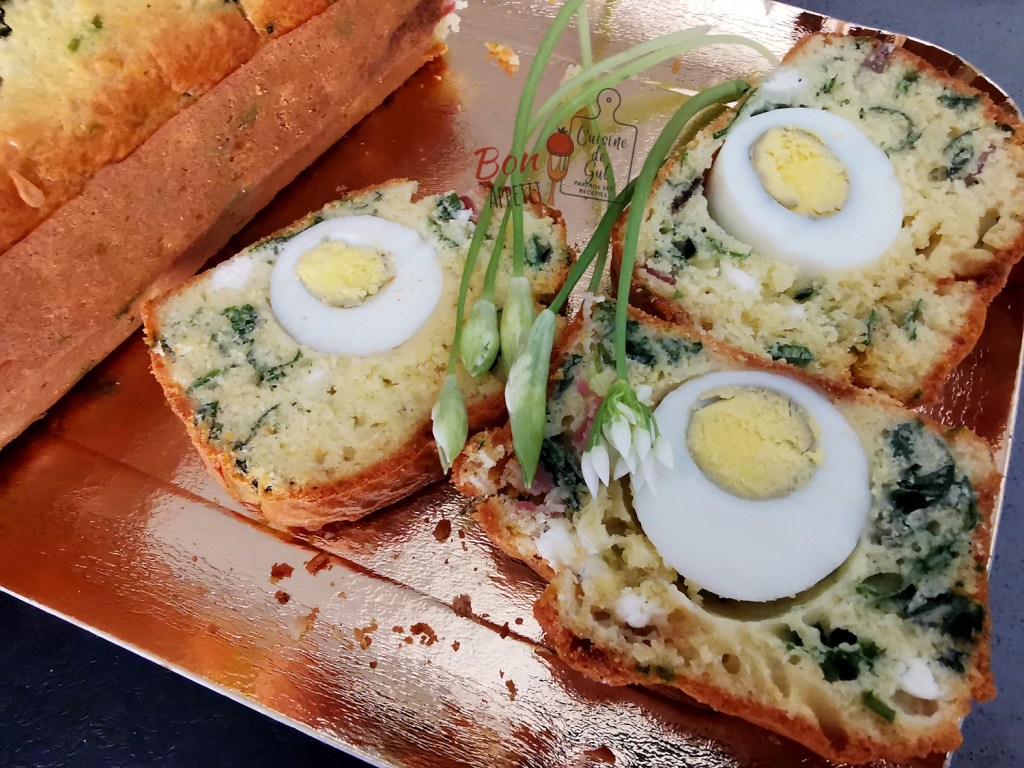 Cake aux oeufs durs, coppa, feta à la truffe et ail des ours
