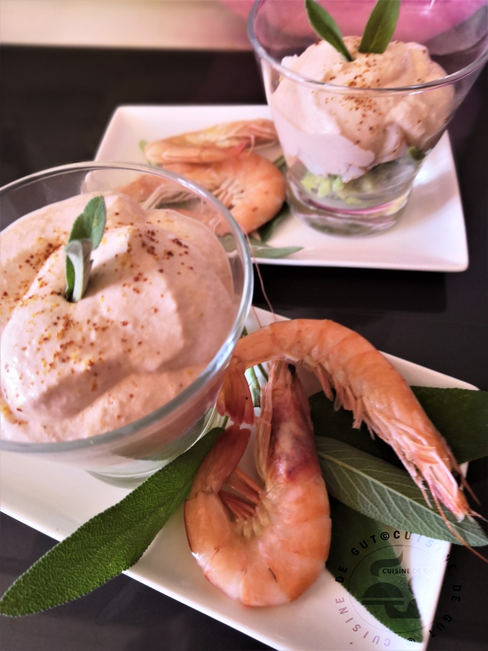Mousse de Burrata tomate aux herbes sur avocat crevettes