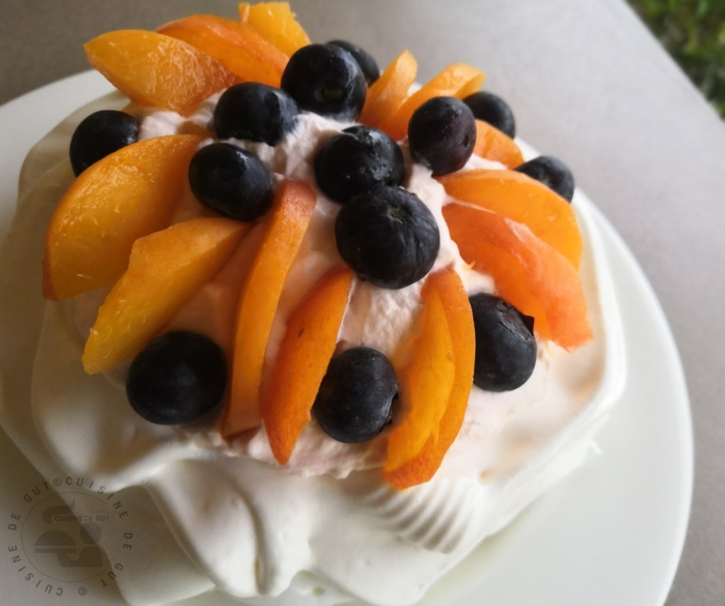 Pavlova abricot myrtilles à la Piña Colada