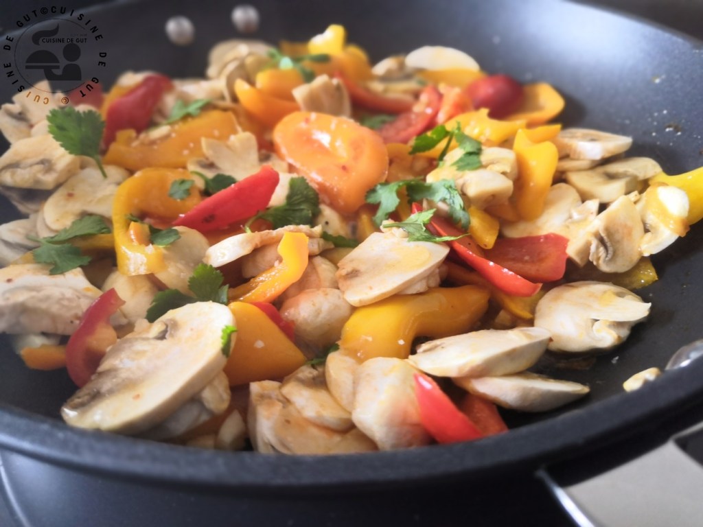 Poêlée de champignons et poivrons légèrement acide et cabillaud