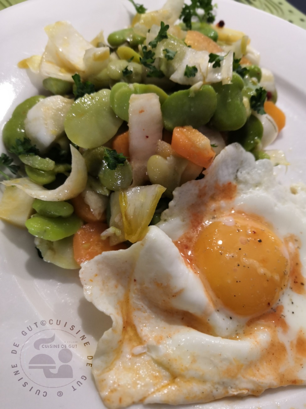 Oeuf au plat aux fèves carottes et endives