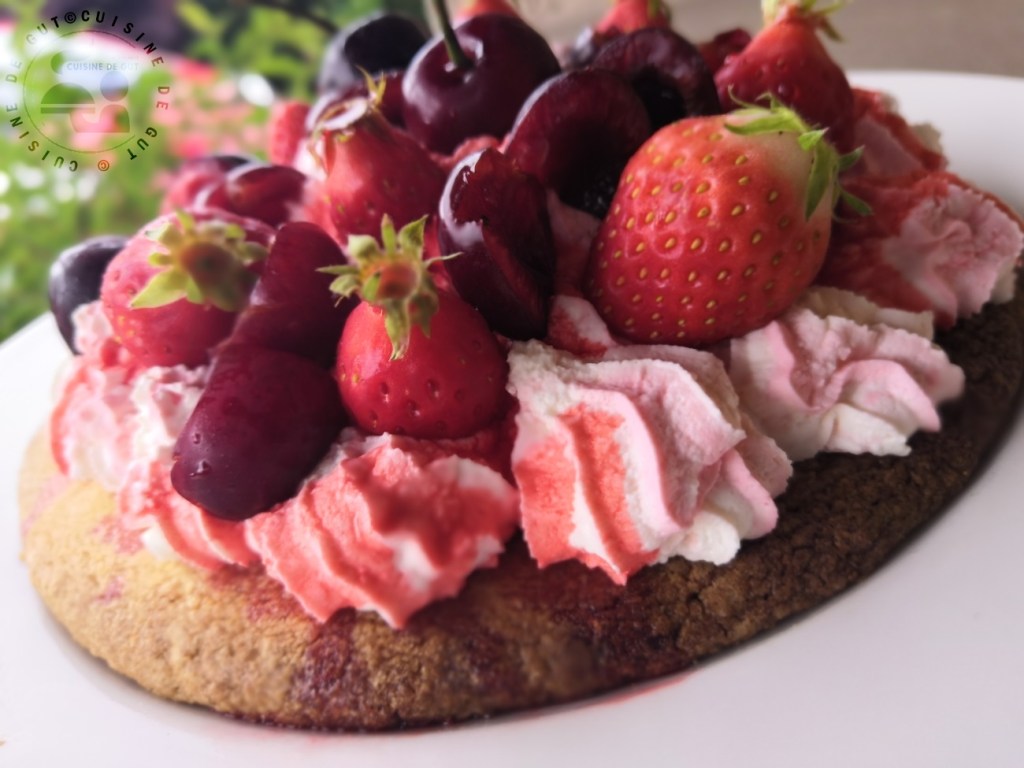 Tarte aux fraises et cerises sur sablé breton chantilly grenadine