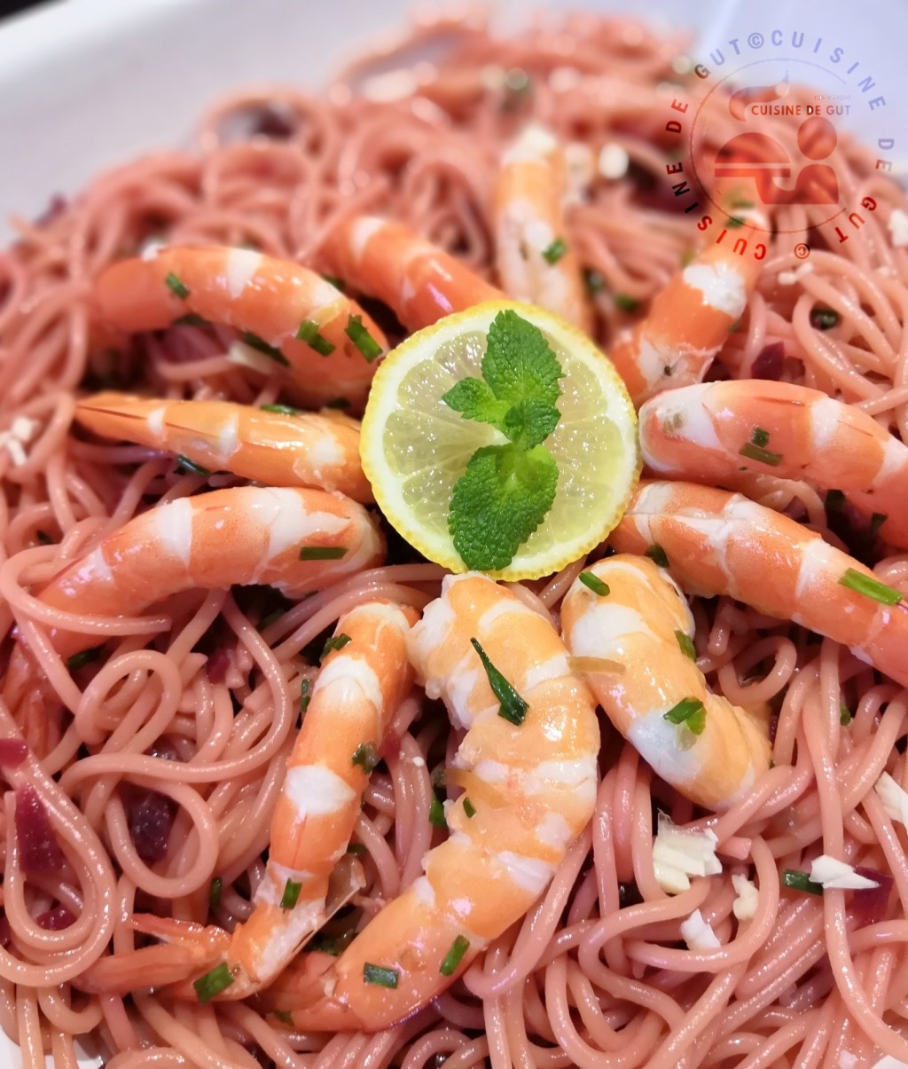 Salade de Spaghetti roses et crevettes marinées pour le CMUM