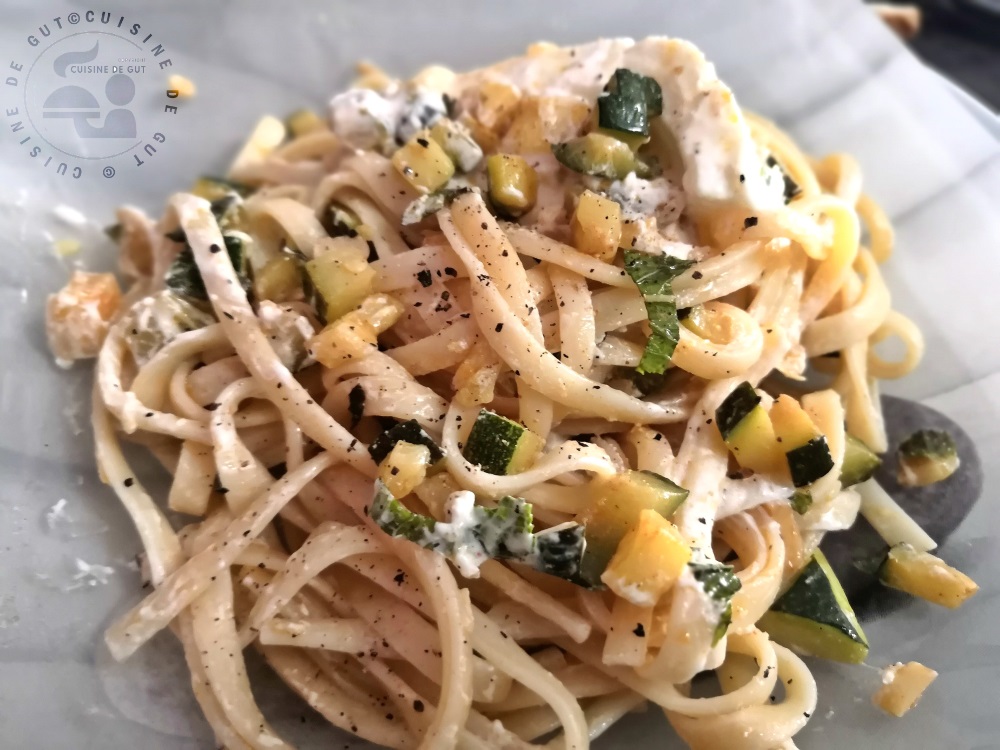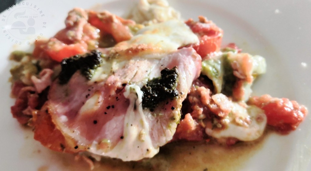 Courgette farcie saucisse aux herbes, tomate confite et feta