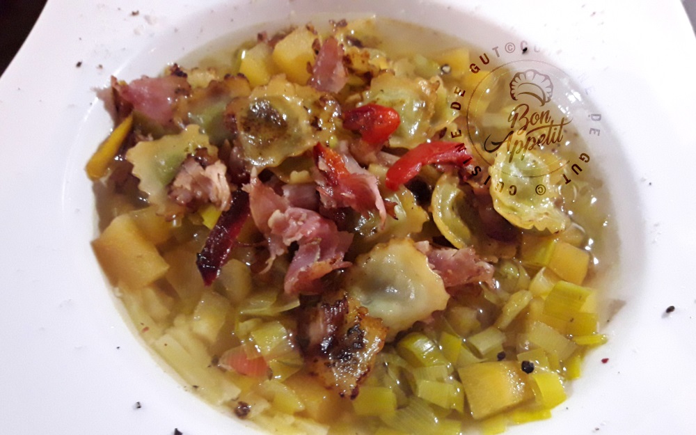 Soupe de Boules d’or, poireaux et ravioles à poêler