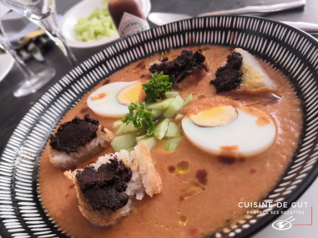 Gaspacho maison oeufs durs et pain grillé à la tapenade