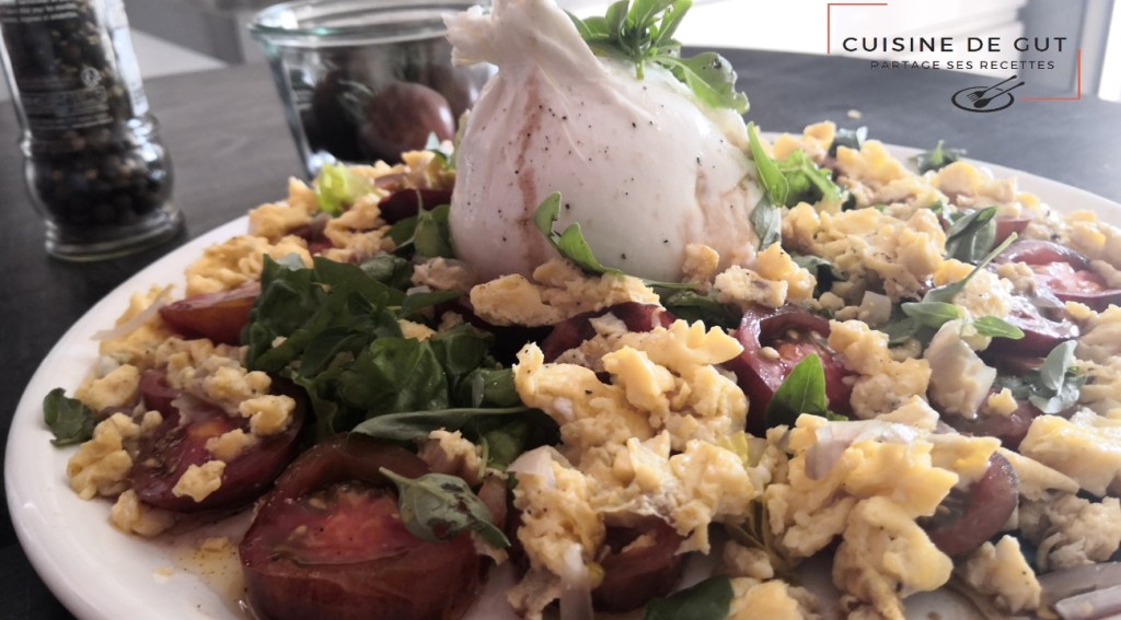 Salade de tomate prune, Burrata, oeufs brouillés et Basilic nain