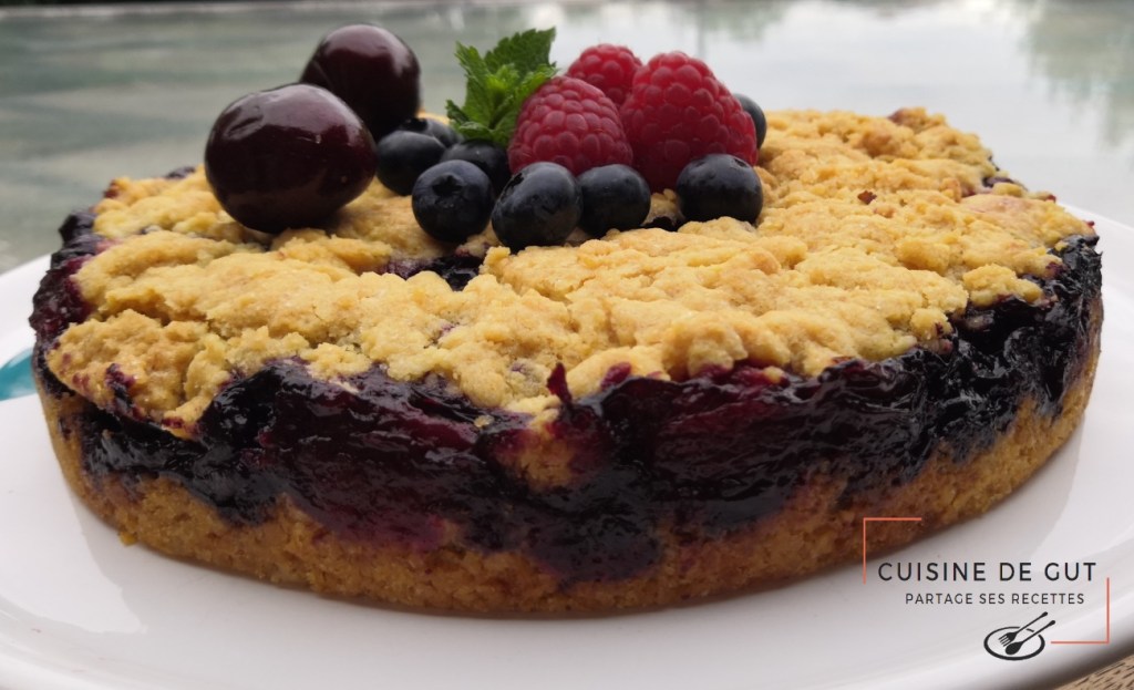 Gâteau crumble aux myrtilles framboises et cerises parfumées Amaretto
