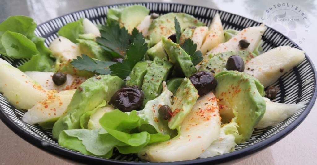 Salade de poires et avocat, olives noires et câpres