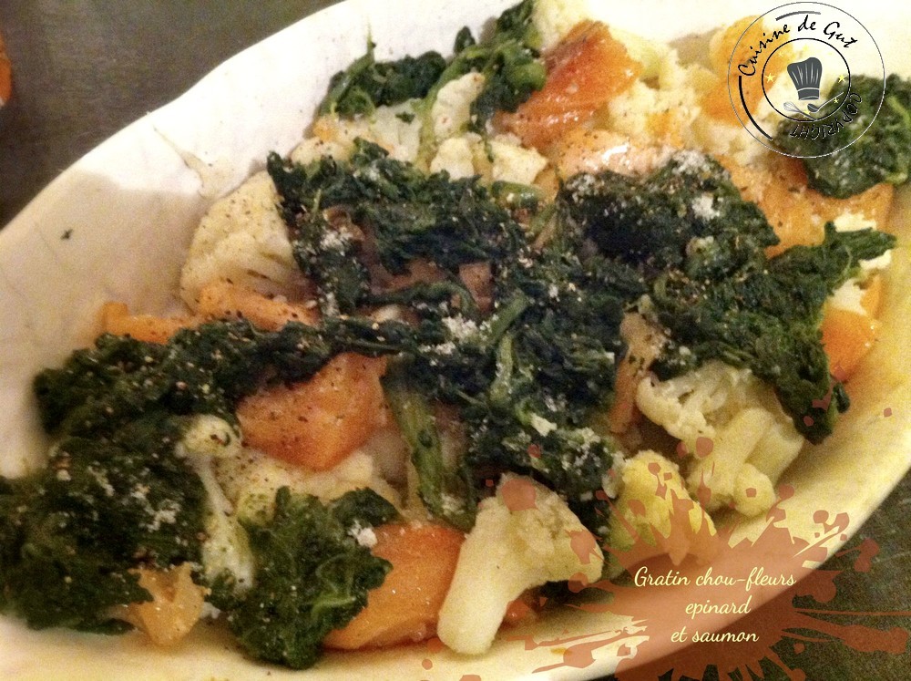 Gratin chou-fleurs, épinard au saumon