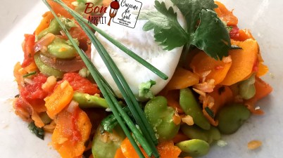 Légumes, fèves et oeuf poché pour un repas complet express