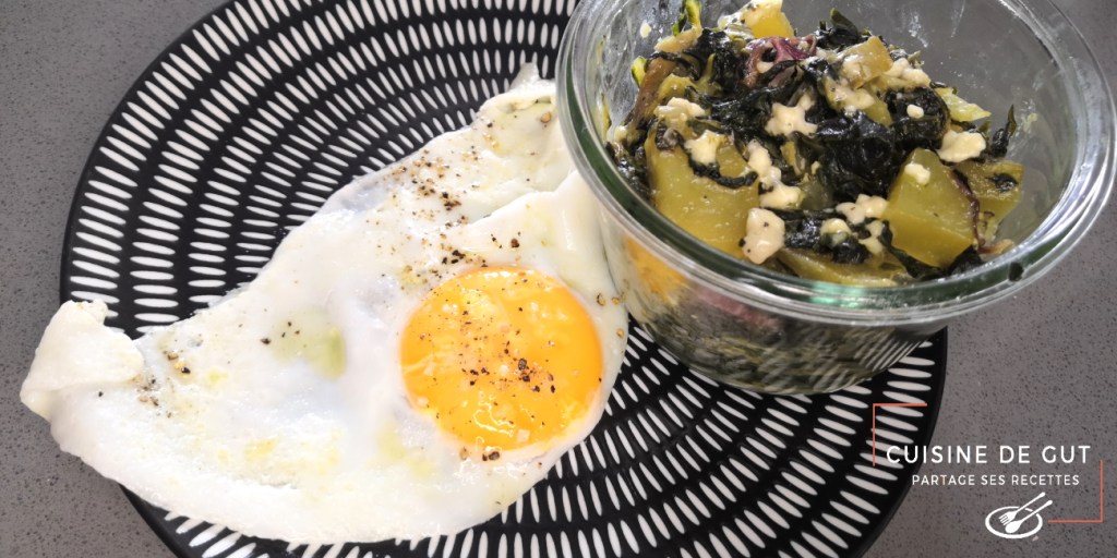 Feuilles de blettes et pommes de terre feta et oeuf sur le plat