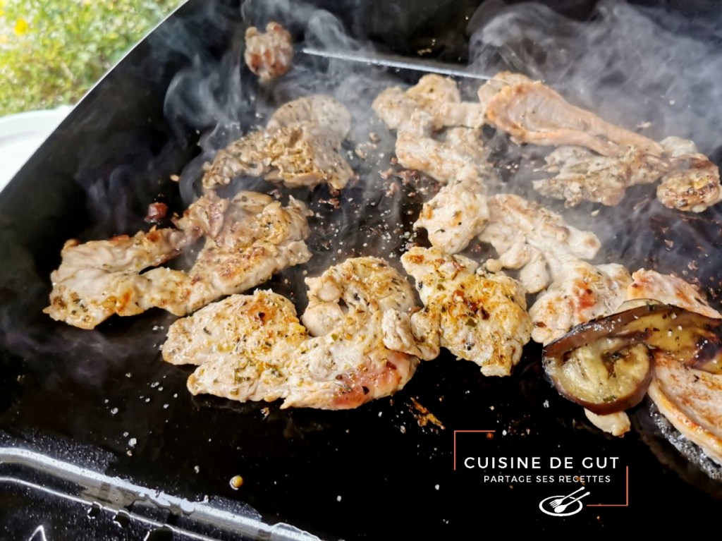 Cigaline de porc et aubergines marinées à la plancha