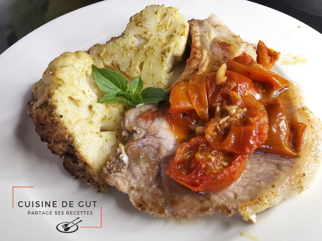 Chou fleur entier au pesto et côte de porc tomates