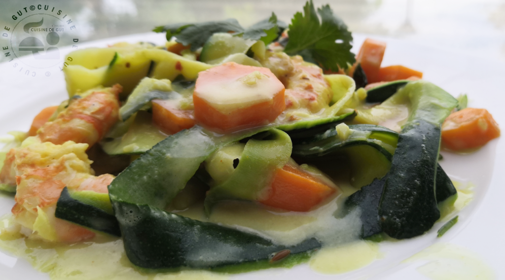 Crevettes, tagliatelles de courgettes/carottes au curry et crème de coco