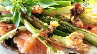 Bruschetta d’asperges grillées au parmesan sur lit de chèvre et saumon