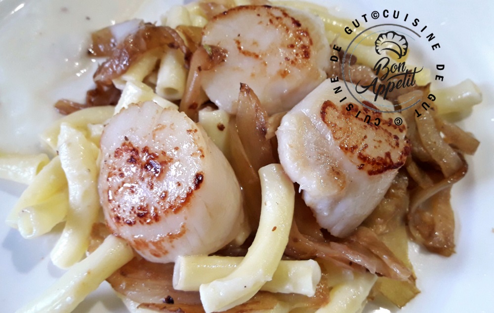 Noix de Saint jacques, crème de fenouil à l’huile de truffe sur lit de macaroni