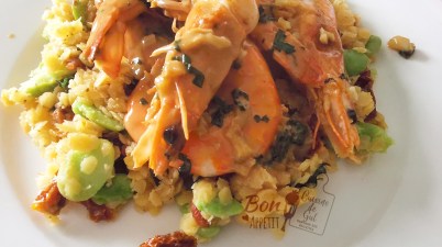Crevettes sauce coco aux fèves, tomates séchées et lentilles corail