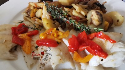 Eglefin au thym frais pommes de terre, champignons et piquillos