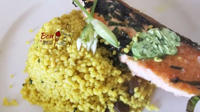 Saumon à l’ail des ours et couscous citron et beurre d’ail des ours