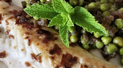 Filet de bar et petits pois au oignons de Yotam Ottolenghi