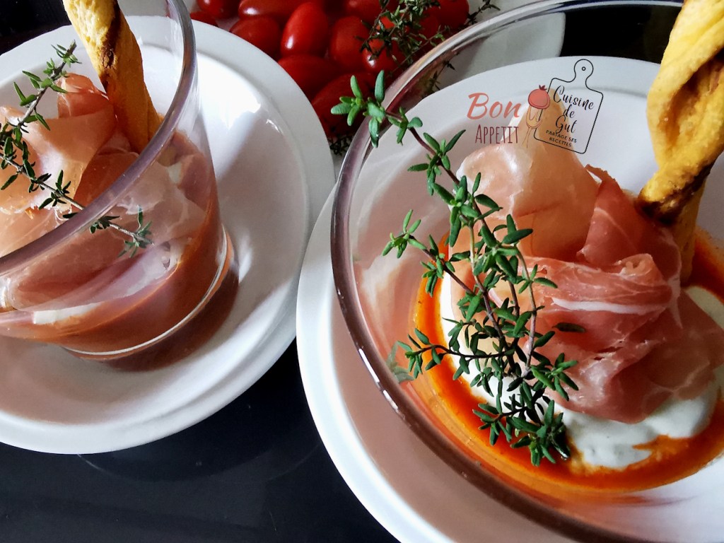 Compotée de tomates au thym, fromage frais au pesto et chiffonnade de jambon