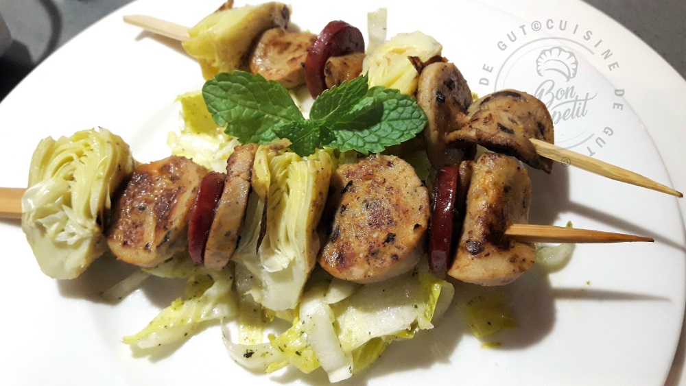 Petites brochettes de boudin truffé sur lit d’endives
