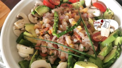 Salade de Trofies aubergines au pesto d’olives et basilic en accompagnement de Crevettes et joues de lotte