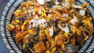 Grillade de porc, pâtes Orzo et légumes au curcuma et parmesan
