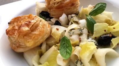 Découvrez cette Combinaison Gourmande de Salade d'Endives et Mini-Tourtes bien feuilletées à la poire et fourme d'Ambert sans oublier sa bonne confiture de poire !