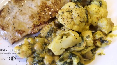 Bavette de veau, curry de chou fleur pois chiches et épinards