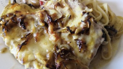 Côtes de porc au four au vin blanc, crème et oignons grillés