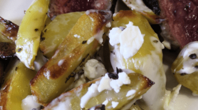 Côte de boeuf et pommes de terre à la crème aigre et feta