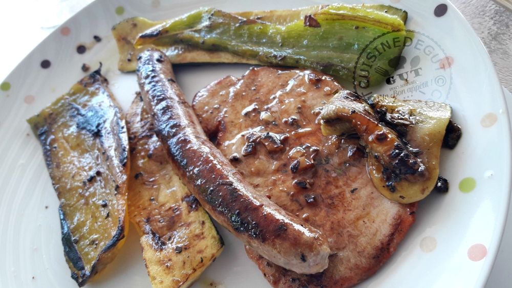Plancha de lomo saucisses courgettes et poivrons marinés